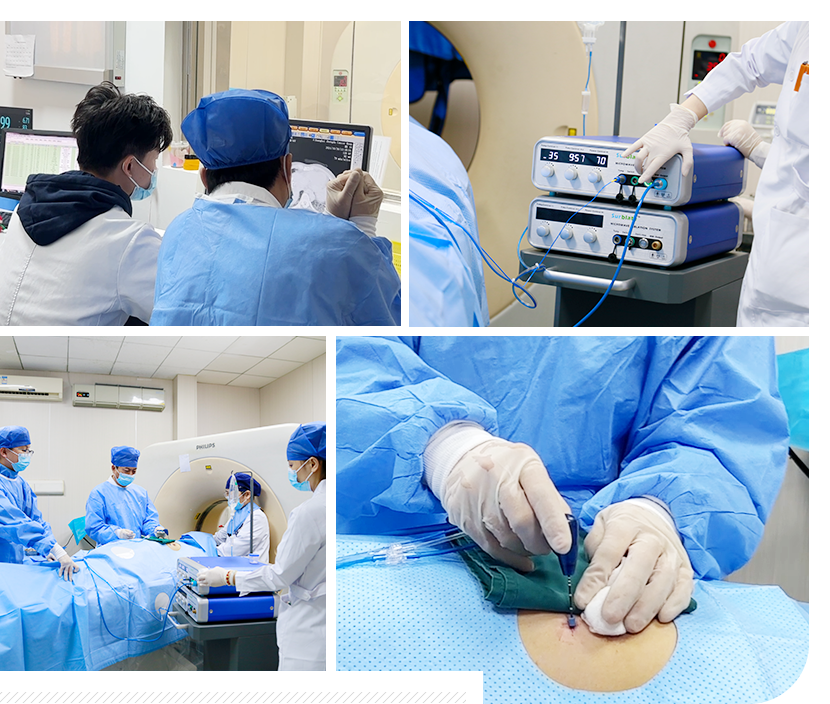 • 微创介入治疗是一种介于外科和内科之间的新兴治疗方法,在高端的数字减影血管造影机(DSA)、CT、核磁共振、超声等设备精确引导下,无需开刀,在皮肤上做直径几毫米大小的微小通道,经人体原有的管道,用穿刺针、导丝、导管、支架等精密器械对肿瘤病灶局部进行微创治疗。